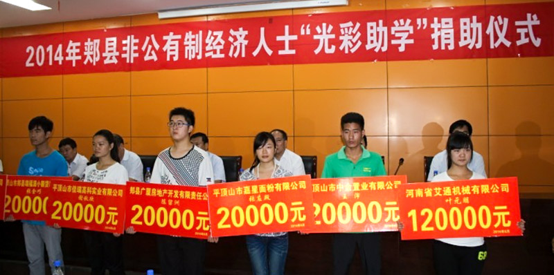 8月26日,郟縣2014年非公有制經(jīng)濟(jì)人士光彩助學(xué)捐助儀式在縣一高隆重舉行,郟縣縣委常委、統(tǒng)戰(zhàn)部長(zhǎng)張貫釗,縣政府副縣長(zhǎng)李國(guó)英,縣政協(xié)副主席、縣工商聯(lián)主席薛國(guó)強(qiáng),縣教體局局長(zhǎng)劉學(xué)增,縣一校長(zhǎng)李國(guó)恩等有關(guān)領(lǐng)導(dǎo)及工商聯(lián)、一高二高負(fù)責(zé)同志,捐資助學(xué)的企業(yè)家和受助學(xué)生代表參加儀式。此次, 河南艾通科技股份有限公司捐資10萬(wàn)元繼續(xù)資助縣一高“艾通高考教育中心”的優(yōu)秀貧困學(xué)子。