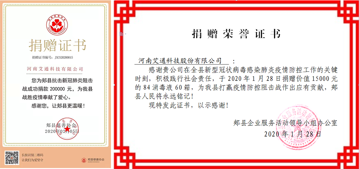 在抗疫的關(guān)鍵時刻,醫(yī)療防護物資非常緊缺。得知這一消息后,艾通公司董事長葉元朋先生視疫情為命令,迅速通過各種渠道聯(lián)絡(luò)采購防疫物資,在疫區(qū)隔離、交通不便的情況下,調(diào)動一切資源收集各類醫(yī)療保障物資支援抗災(zāi)。率先向郟縣工信局疫情防控組捐贈84消毒液60箱,防護口罩500個,公司還向郟縣縣慈善會捐贈現(xiàn)款20萬元。