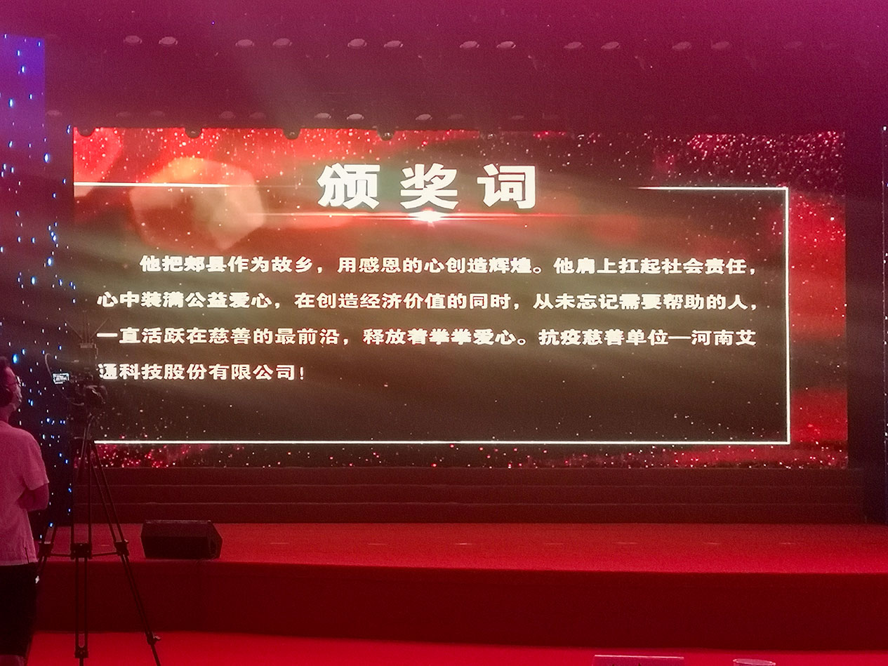 9月5日下午,在郟縣會(huì)議中心隆重舉行慶祝第五個(gè)“中華慈善日”慈善活動(dòng)。河南省慈善總會(huì)副會(huì)長(zhǎng)盛國(guó)民,河南省慈善總會(huì)副秘書(shū)長(zhǎng)和占鶴,平頂山市慈善總會(huì)會(huì)長(zhǎng)高德領(lǐng),郟縣縣委書(shū)記丁國(guó)浩,平頂山市慈善總會(huì)副會(huì)長(zhǎng)劉紹卿、周俊范,郟縣縣領(lǐng)導(dǎo)邱永剛、魯長(zhǎng)法、何留忠、吳紅強(qiáng)、周慧敏,郟縣慈善協(xié)會(huì)會(huì)長(zhǎng)肖根勝等出席活動(dòng),并分別為抗疫慈善單位和個(gè)人頒獎(jiǎng)。公司副董事長(zhǎng)趙超越、副總經(jīng)理南海龍受邀參加了慈善頒獎(jiǎng)活動(dòng)?;顒?dòng)現(xiàn)場(chǎng),對(duì)在今年疫情爆發(fā)以來(lái)河南艾通科技股份有限公司捐款捐物達(dá)43.5萬(wàn)元的獻(xiàn)愛(ài)心行動(dòng),給予了充分肯定。公司全體員工要珍惜這個(gè)榮譽(yù)稱(chēng)號(hào),在創(chuàng)造經(jīng)濟(jì)價(jià)值的同時(shí),保持捐獻(xiàn)愛(ài)心的熱情,不忘需要幫助的人,及時(shí)伸出援助之手,充分彰顯公司的社會(huì)責(zé)任與為民情懷。
